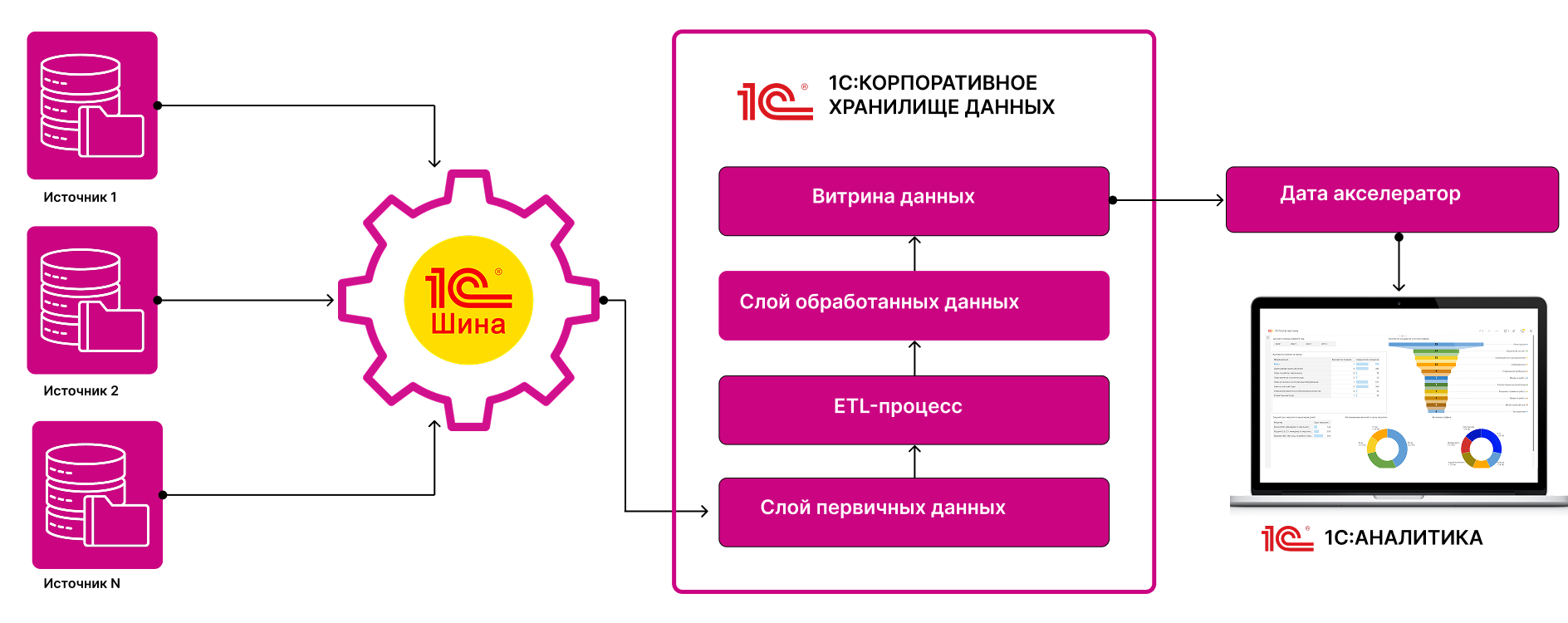 1С КХД поддерживает процессы ETL, централизованное управление данными, формирование аналитических витрин и отчетности для последующего бизнес-анализа средствами платформы «1С:Предприятие 8» или в продукте «1С:Аналитика» на уровне всего предприятия.